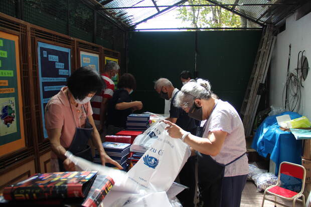 僑胞志工事先到聯絡處,依名單各年級所需分裝文具